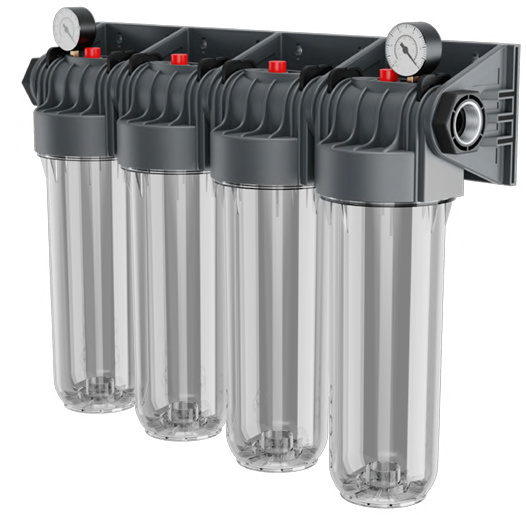 Euro-Fil 4 x 10" filterhuis met sleutel en support en 2 drukmeters