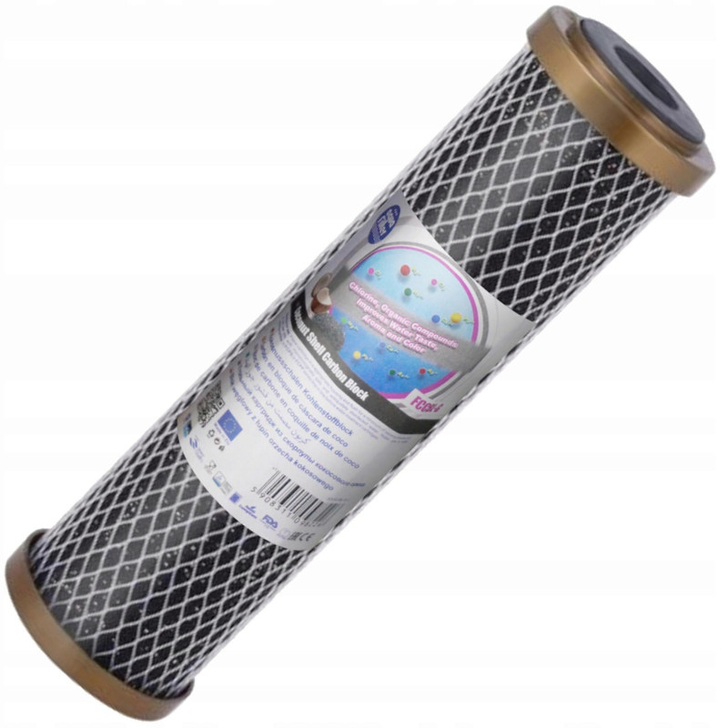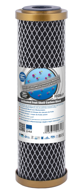 OverzichtFCCBL-G 10" GOLD actiefkoolfilter van fruitschillen van AQUAFILTER Het FCCBL-P actiefkoolfilter van coconut schalen reduceert: chloor en de giftige stoffen daarin, zware metalen, detergenten, organische chemicaliën en pesticiden.